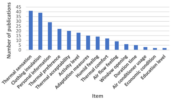 | Thermal sensation | The middle three values (−1, 0, 1) of the ASHRAE seven-point scale are considered as satisfactory or acceptable, while the thermal sensation votes (−3, −2, +2, +3) are considered as unacceptable | [41,45,57,61,62,66,103,105] |