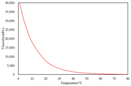 - The relationship between crude oil viscosity and temperature [26] is shown in Equation (15). The viscosity–temperature curve of crude oil is plotted based on the viscosity–temperature relationship, as shown in Figure 2. The inflection point temperature of the crude oil can be determined as 40 °C based on Figure 2. The viscosity μ of crude oil is mainly used for calculating the heat transfer coefficient hf.