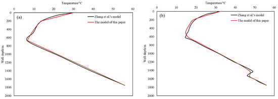 The offshore electrically heated lifted heavy oil wellbore model developed in this paper is compared with the previous models to verify the accuracy of the present model [27]. Inputting the same parameters as the previous model, the temperature distributions were verified for ambient and electrically heated conditions, as shown in Figure 5a and Figure 5b, respectively. The validation results show that the results of this model are less different from the previous results and the results are in good agreement.