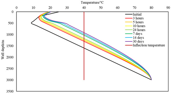 In order to investigate the effect of different production on the temperature distribution of the heavy oil wellbore, the temperature distribution of the wellbore after 3 h, 10 h, 24 h and 30 d at production of 40, 50, 60, 70, 80, 90 and 100 m3/d was investigated, as shown in Figure 7. As can be seen in Figure 7, the higher the production, the higher the wellbore temperature distribution in general. As the extraction time increases, the more obvious the distinction between the wellbore temperature distributions at different production. However, at the initial stage of extraction of heavy oil (before 10 h) and at a certain depth in the seawater section, there will be a situation where the higher the production, the lower the temperature.