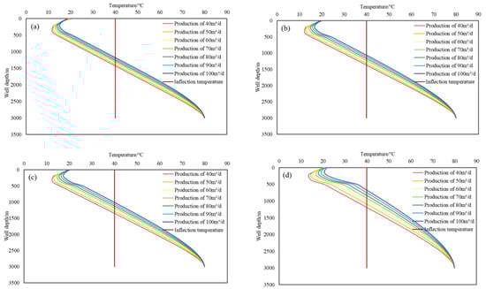 Influence of different production on the temperature field of the wellbore at different periods of exploitation: (a) 3 h; (b) 10 h; (c) 24 h; (d) 30 days.