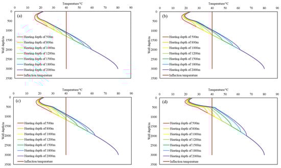Influence of different heating depths on the temperature field of the wellbore at different periods of exploitation: (a) 3 h; (b) 10 h; (c) 24 h; (d) 30 days.