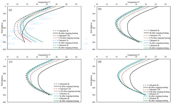 Temperature field two hours after stopping heating at different heating times compared with the temperature field of the wellbore at the same time without heating: (a) 1 h; (b) 3 h; (c) 5 h; (d) 10 h.