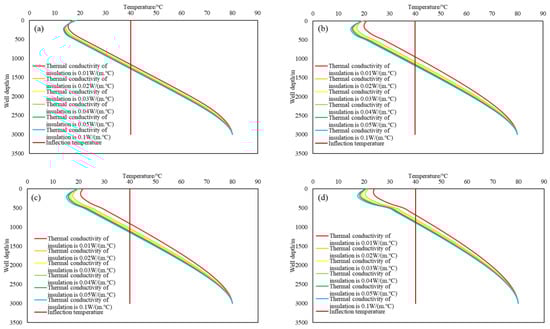 Influence of different thermal conductivities of insulation on the temperature field of the wellbore at different periods of exploitation: (a) 3 h; (b) 10 h; (c) 24 h; (d) 30 days.