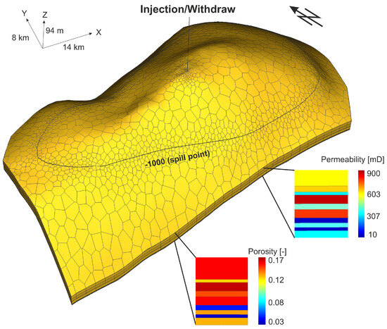 A geological model of the Konary structure was built as part of earlier study [38], in which the Lower Jurassic reservoir—the Komorowo Formation—was adopted as the storage formation. The data used to create the geological model are presented in detail by Luboń and Tarkowski [38] and Luboń [59,60]. Two deep wells within the Konary structure were modeled: Konary IG-1 and Byczyna 1. Based on the analysis of geophysical data on Byczyna 1 [61], the storage formation was subdivided into ten layers, where the determined values of porosity, permeability, and rock density were allocated (Figure 1). The kriging method was used for interpolation.