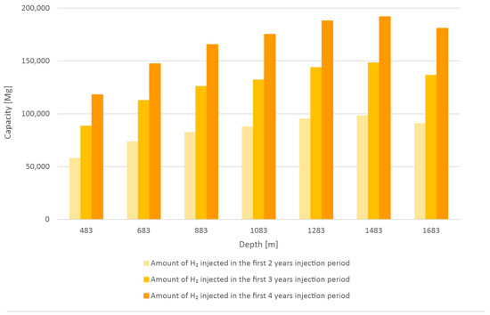 The flow rate parameter (the weighted average of the hydrogen injection periods in the initial filling period) varied between 0.93 and 1.54 kg/s, depending on the depth variant. This indicates that a higher flow rate can be used as the depth increases up to 1483 m. However, at a depth of more than 1683 m, the flow rate decreased to 1.44 kg/s. The possibility of using a higher flow rate with increasing depth (up to 1483 m bsl) means that more hydrogen can be stored with increasing depth, thus increasing the total capacity. For the shortest initial filling period (2 years), this capacity increased from 57,830 Mg at the shallowest depth below sea level to 98,182 Mg at a depth of 1483 m (Table 2 and Figure 2). Increasing the depth to 1683 m resulted in a decrease in the total capacity to 90,711 Mg. For the 3-year initial filling period, the total capacity ranged from 88,441 Mg at the shallowest depth considered to 148,323 Mg at a depth of 1483 m. However, for the longest initial filling period (4 years), the total capacity at the shallowest depth was 118,129 Mg, and at the greatest depth considered, it was 181,048 Mg, with a maximum total capacity of 191,941 Mg at a depth of 1483 m.