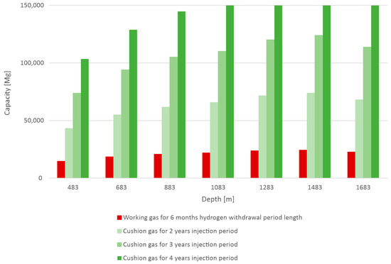 The large amount of cushion gas required for hydrogen storage was noted by Pfeiffer and Bauer [46]. Heinemann et al. [51,52] emphasized that the cushion gas quantity influences the working gas’s injection and withdrawal efficiency. In our case, the amount of cushion gas significantly increased with the extension of the initial filling period and the depth of the hydrogen storage foundation up to 1483 m, where the maximum amount was recorded. The volume of the gas cushion decreased at greater depths.