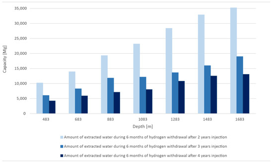A certain amount of water was extracted during the 6-month hydrogen recovery cycle (the quantity of water extracted throughout the withdrawal cycle) (Table 2 and Figure 4). This quantity increased with a decreasing initial filling period and increasing storage depth. For the shortest initial filling period of 2 years, the amount of water extracted at the shallowest depth of 483 m was 10,195 Mg, while the amount was 35,218 Mg at the greatest depth of 1683 m. For the longest initial filling period equal to 4 years, the amount of exploited water was equal to 4246 Mg at the shallowest depth, while the amount was 13,078 Mg at the greatest depth.