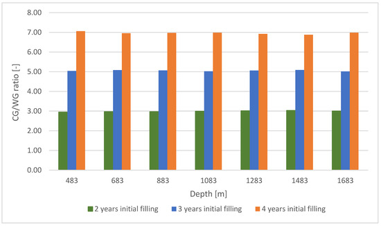 The results of studies on various factors influencing the CG/WG ratio presented by Heinemann et al. [51,52] indicate that the ratio decreases with increasing depth. This discrepancy could be explained by the adoption of different modeling assumptions for the injection and cyclic operation of the hydrogen storage. The results presented in this paper also indicate that the CG/WG ratio depends on the length of the initial filling period. The longer the initial filling period, the higher the CG/WG ratio, assuming the same working gas volume. It ranged from 2.9–3.03 for a two-year initial filling period, 5.02–5.09 for a three-year initial filling period, to 6.92–7.06 for the longest four-year initial filling period.