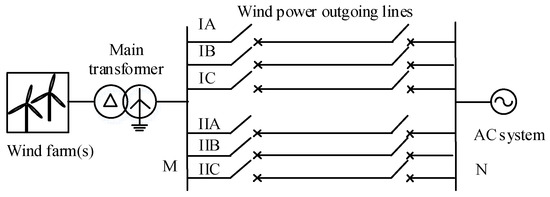 A double-circuit transmission line has the advantages of a large transmission capacity and a small occupied corridor [1,2,3,4,5,6], etc. Large-scale wind farms are usually connected to the grid by a high-voltage double-circuit transmission line. At the same time, the wide variety of faults makes it difficult to formulate the reclosing logic [7,8,9]. And, according to the statistics, 80% of high-voltage overhead transmission line faults consist of transient faults [10,11,12,13,14,15,16,17,18,19,20,21,22]. Therefore, most of the actual project involves using automatic reclosing to improve the reliability of the power supply. But, with automatic reclosing, if reclosing permanent faults, this will cause a secondary impact on the power grid. Adaptive reclosing distinguishes the nature of the fault before reclosing and can avoid reclosing permanent faults. In addition, the injection of negative sequence components into the system increases the risk of successive phase change failures in the high-voltage DC (direct current) transmission system, as well as exacerbating the heating of the stator–rotor windings of doubly fed wind turbines, which affects the stability of the system. If the line trips on a single phase due to a fault, the negative sequence current injected into the wind turbine during the non-full-phase operation of the line exceeds the set value, and the protection action will cause the wind turbine and the grid to be unlisted. If the capacity of the wind power system operating on the grid is large, a large-scale turbine becoming off-grid will affect the operational stability of the whole system.