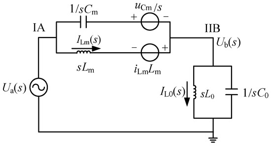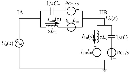 In Figure 4, Ua(s) and Ub(s) represent the voltages of the closing and fault phases, respectively; uCm indicates the instantaneous voltage of IAIIB inter-phase capacitance at the time of N-side closing; iLm denotes the instantaneous current of IAIIB inter-phase equivalent inductance at the time of N-side closing; uC0 refers to the instantaneous voltage of IIB relative ground capacitance at the time of N-side closing; and iL0 stands for the instantaneous current of IIB relative ground inductance at the time of IA-phase closing.
