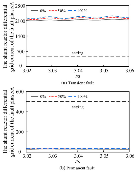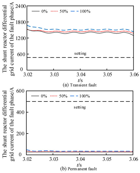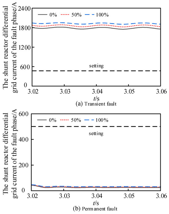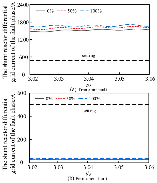 Transition resistance is 150 Ω, the shunt reactor differential grid current of the fault phase at single-phase grounded fault. (a) Transient fault current; (b) permanent fault current.