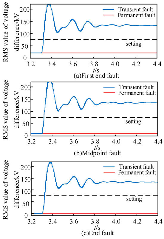 When the nature of the fault is permanent, the IA and IIB phases are continuously connected by the transition resistance. Therefore, the inter-phase transition resistance is only tens of ohms. In this case, the voltage of the reclosed phase IA is the same as that of the fault phase IIB. Additionally, the root mean square (RMS) of the voltage difference between the two phases is close to zero.