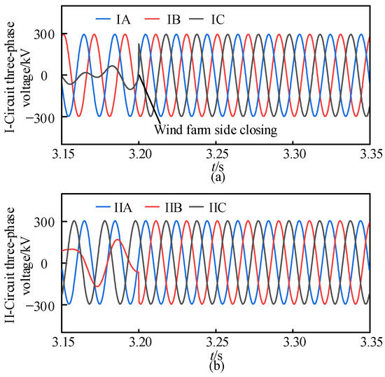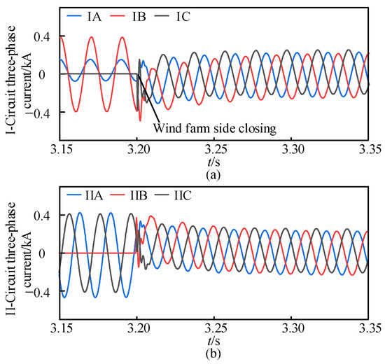 (1) Configuring each of the two circuit lines using a single-phase recloser. After single-phase tripping of the wind power transmission line, due to the asymmetry of the three-phase system, a large number of negative sequence currents will be injected into the wind farm (group) [22,23], causing mechanical damage, aggravating the heating of the stator and rotor windings, and affecting the stability of its grid-connected operation.