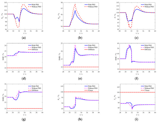 Figure 8d–i indicate that regardless of whether the PSO method is used or not, the engine outputs are far from the constraint boundary. Figure 8a–c show that during the transition process, the fluctuations in closed-loop thrust F and LP rotor speed NL are 1.5% and 2.67%, respectively. In the absence of linear changes in PSO, these numbers are 2.4% and 3.5%, respectively. In addition, the fluctuation of HP rotor speed NH under PSO conditions is 3.4%, which is significantly smaller than the response of 4.7% under no PSO conditions. The results show that the mode transition control method can realize smoothly, safely and quickly switching from the double-bypass mode to the triple-bypass mode, and the control system with optimized geometrical mechanisms control schedules achieves much smaller response fluctuation magnitudes of thrust and rotor speeds during the mode transition process compared with the traditional linear variation methods, which proves the effectiveness of the control method proposed in this paper.