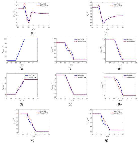 In this simulation, the ACE is switched from triple-bypass mode to double-bypass mode at the subsonic cruise operating point (H = 10 km, Ma = 0.9). The optimized actuator commands and engine responses are shown in Figure 5 and Figure 6, where “with PSO” denotes the optimization results obtained from the PSO, and “without PSO” is the result obtained from the conventional linear variation geometry mechanism. In Figure 6, SMF, SMR, SMC, SMH are the surge margin of FFAN, RFAN, CDFS, HPC. respectively, and P3 and T5 are the output pressure and temperature of HPC and LPT, respectively. The subscript “min” and “max” represent the minimum and maximum limitation of the corresponding variables.