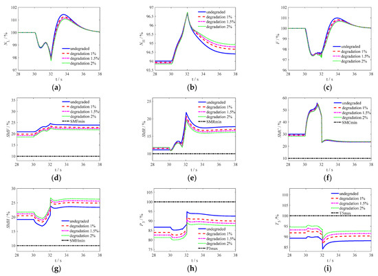 Response curves of ACE under different performance degradation. (a) Response of NL; (b) response of NH; (c) response of F; (d) response of SMF; (e) response of SMR; (f) response of SMC; (g) response of SMH; (h) response of P3; (i) response of T5.