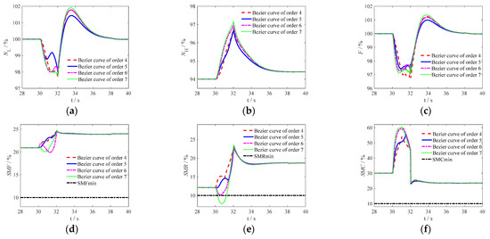 As shown in Figure 10, from Figure 10a–c, the fluctuations of the low-pressure rotor speed NL, high-pressure rotor speed NH and thrust F of ACE are listed in Table 2 to detail the influence of the Bézier curve’s orders.