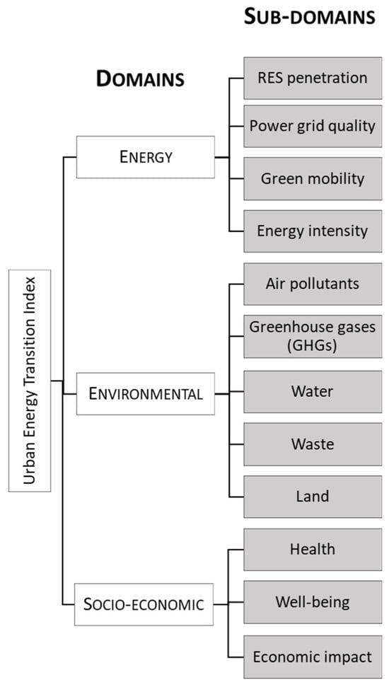 To evaluate the Urban Energy Transition Index, three main domains have been taken into consideration: Energy, Environmental and Socio-Economic. Each domain is further divided into sub-domains as shown in Figure 1.