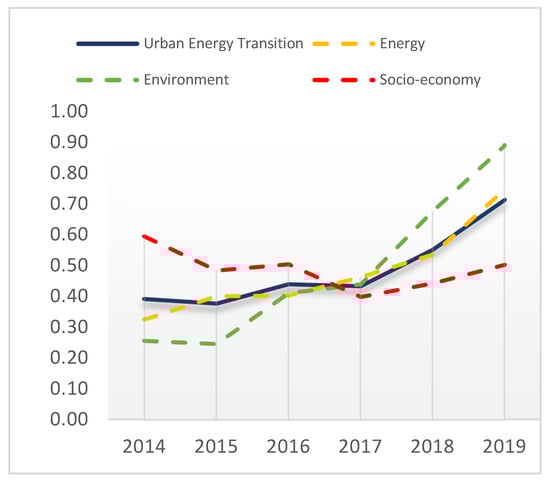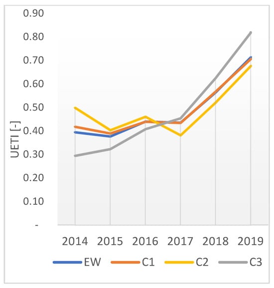 Before proceeding to the aggregation of indicators grouped in the same sub-domain (Table 1), Min–Max normalization is adopted to convert into a common scale each of the 30 indicators: 1 corresponds to the best performance and 0 to the worst performance observed over the period considered (2014–2019). Then, three steps of additive aggregation with equal weight are performed. The first aggregation step results in 12 performance indexes (Table 2): 4 for the Energy domain, 5 for the Environment domain and 3 for the Socio-Economic domain. Similarly, the second aggregation calculates the indexes of performance for the Energy domain, the Environment domain and the Socio-Economic domain. These indexes are combined (third aggregation) to obtain the UETI. The overall scores are shown in Figure 2.