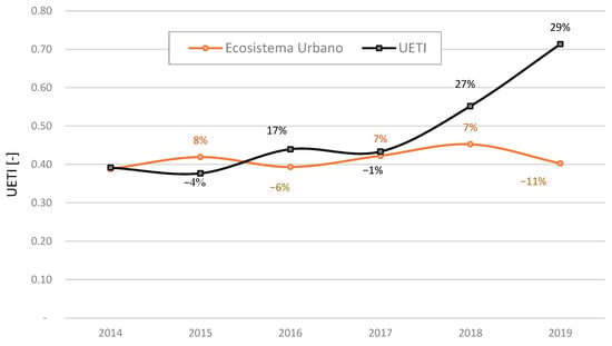 Comparison of UETI’s trend with Ecosistema Urbano’s trend over time (2014–2019).