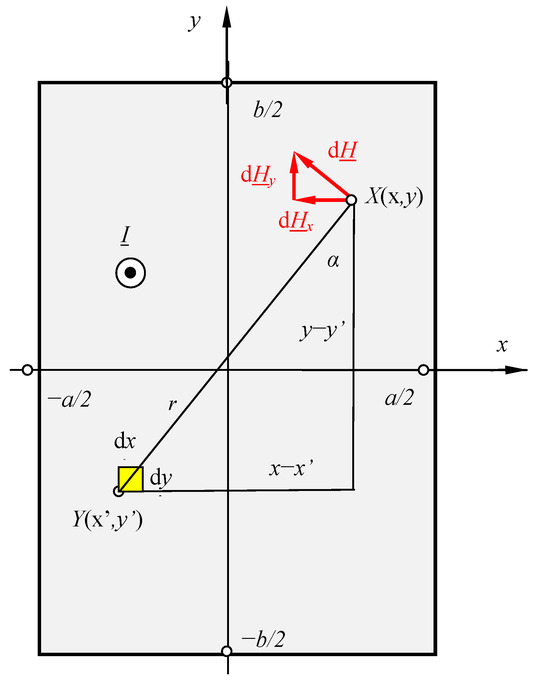 The magnetic field in any point , on the inside or outside of the busbar, can be calculated as a superposition of the fields generated by the current at source pointss with a distance of r from point —Figure 1. For point , we assume the elementary area as