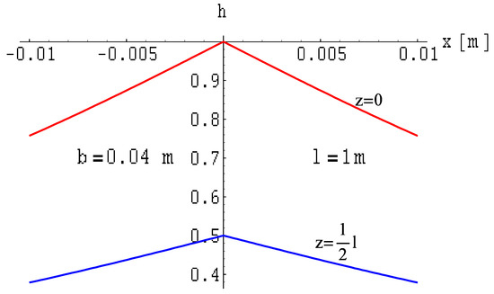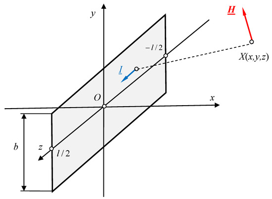 In the case of a ribbon busbar of length l (Figure 6), if we already have formulas from the works [20,42,43,44], we can calculate the magnetic field components by determining the limits of these functions (the details are located in Appendix A) with the cross-section dimension of the busbar . Therefore, we obtain the following formulas: