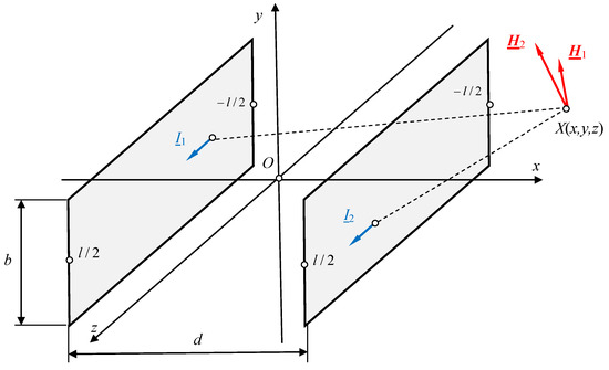 Suppose we have a line made of two ribbon busbars with dimensions and distance d between the busbars (Figure 10), carrying a constant or low-frequency sinusoidal current with complex RMS values and .