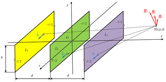 Consider a three-phase line composed of three ribbon busbars with dimensions and a distance d between the busbars (refer to Figure 17). These busbars carry a constant or low-frequency sinusoidal current with complex RMS values , , and .