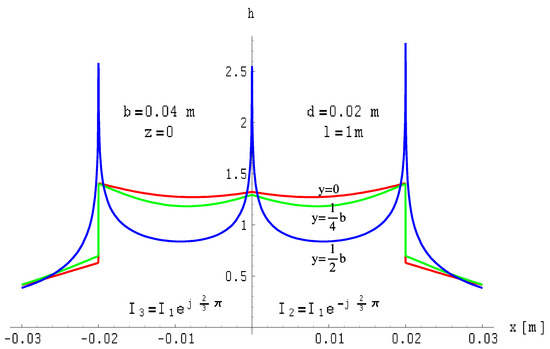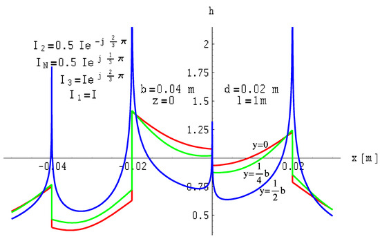 The formulas derived above describe the magnetic fields in ribbon busbars and are very complex, making it difficult to predict the changes in magnetic field distribution after altering, for example, the length of the busbar. However, any software with a graphic component (e.g., Mathematica), will offer a ready-made, excellent tool for a quick visualisation of solutions. Therefore, as illustrated in the figures above, it is possible to quickly analyse the magnetic field of a ribbon busbar after changes are made in the geometrical or electric parameters of the examined circuits.