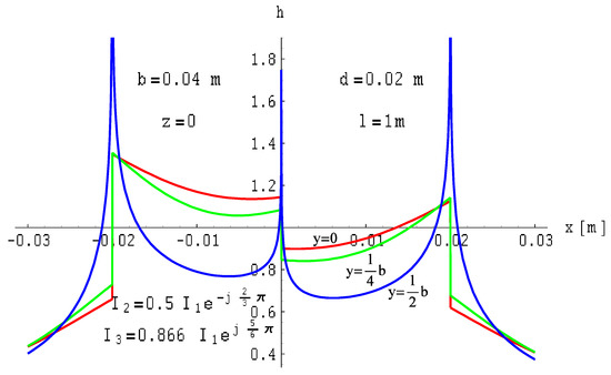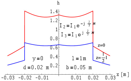 Current asymmetry changes the magnetic field distribution around the considered. As an example, the following phase currents were assumed: and . Therefore, this results in . The field distributions for this case are illustrated in Figure 21, Figure 22 and Figure 23.