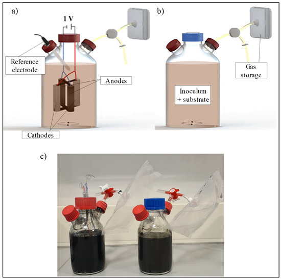 Experiments were carried out in thirteen single-chamber reactors (modified Duran® bottles, Merck, Darmstadt, Germany) with a working volume of 0.4 L each (Figure 1), equipped with a gas bag (Ritter, Bochum, Germany) to collect the gas produced. Six of them also contained an electrolytic module (anode + cathode) and an Ag/AgCl as a reference electrode (Sigma-Aldrich, St. Louis, MO, USA). Each electrolytic module consisted of four graphite rods (diameter: 1 cm; length: 5 cm) in cross-shaped configuration as indicated in Figure 1a. Two sticks were connected as anodes while the other two operated as cathodes. This arrangement is based on the configuration proposed by Alonso et al. [24]. The electrodes were connected to a potentiostat (applied voltage: 1 V) using titanium wires covered with heat-shrink tubing (as insulator), as shown in Figure 1a. The remaining 7 reactors were operated as conventional anaerobic digesters (Figure 1b).