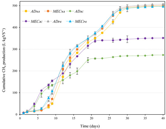 Although the reactors that were supplemented with activated carbon (MECAC and ADAC) started to produce methane 5 days earlier than the rest, their cumulative methane production at the end of the tests was notably lower. Similar results have been reported by other authors: in Jiang et al. [22], for instance, it was observed that granular activated carbon favoured the start-up of an AD process (probably because it provides enhanced direct interspecies electron transfer (DIET)), although it ultimately resulted in a diminishment of the overall CH4 production yields; and Fujinawa et al. [23] found that the use of conductive carbon nanoparticles (2% w/v) inhibited the methanogenic process. However, and despite the negative impact of activated carbon on methane production, it is important to note that it was only in the AC-supplemented reactor that the MEC seemed to provide any substantial contribution to the total methane production, allowing the methane yield to increase by approximately 22%. For all other circumstances, the presence of the MEC did not add any additional benefit in terms of biogas yield, which is coherent with the results reported by Park et al. [29], where the contribution of MEC to the total biogas production in an MEC-AD system was negligible. However, results in Figure 2 seem to indicate that the MEC in the non-supplemented reactors (MECNA) accelerated the kinetics of methane production (in comparison to ADNA) which, for continuous industrial systems (that operate with very tight retention times), can become a practical advantage by accelerating the process in one or two days (this could mean an increase of 2–4% in methane production in real-life continuous AD systems).