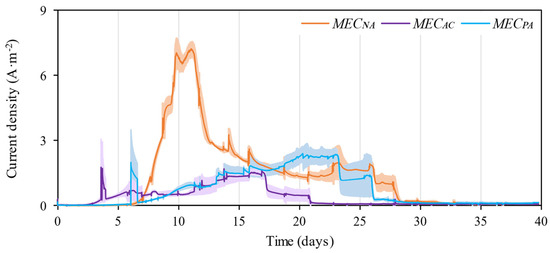 Averaged current profiles measured in the reactors containing an MEC. The shaded areas mark the interval of variability across replicates.