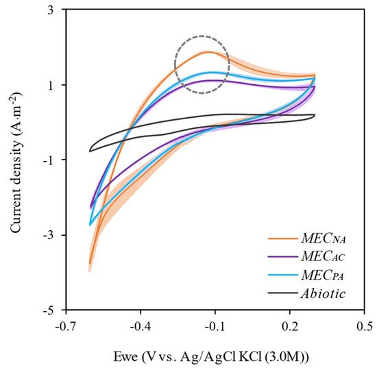 To further understand the impact of the different supplements on the AD and MEC-AD processes, cyclic voltammetry (CV) and microbiology analyses were carried out at the end of the experiments. CV results (Figure 4) suggest the existence of a developed electroactive biofilm for all the biotic electrodes, with a well-defined oxidation peak around −0.2 V vs Ag/AgCl, that can be attributed to acetate oxidation (dashed circle) [14,30]. The largest peak was observed for the MECNA (followed by MECPA and MECAC), which is coherent with the current profiles measured during the experimental phase (Figure 3). The different behaviour between AC and PA could be explained by a larger micropore surface area present in AC (see Section 2.1 for the surface characterisation of the tow additives), which could cause more damage to the cell walls/membranes and therefore contribute to the destruction of the biofilm.