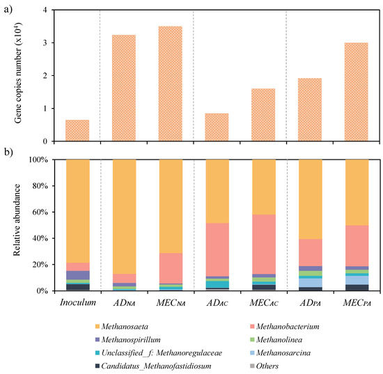 Microbiology analyses were carried out to determine the influence of the MEC and the carbonaceous materials on the different microbial communities. Figure 5a shows the quantifications (qPCR) of the archaea populations of the initial inoculum and of the bulk of the different reactors at the end of the experiments. The reactors without additives (ADNA and MECNA) showed the largest presence of archaea, undergoing a significant growth compared to the inoculum. In contrast, this domain experienced a much-limited growth in the reactors supplemented with AC, something that could explain the low productivity of the ADAC and MECAC (Figure 2). These results support the theory previously proposed by Fujinawa et al. [23] that some structures of carbonaceous materials could damage the cell membrane/walls, leading to lysis of microorganisms and therefore a reduction in the microbial population (the biophysical processes that induce the destruction of phospholipid membranes are complex and can be attributed to several factors [31]). Although the PA-supplemented reactors also showed a diminishment in the population of archaea (Figure 5a), this reduction was less dramatic than that observed for the AC tests (the number of gene copies of archaea in PA doubled that of AC). In addition, the relative abundance of Methanosaeta (a robust and efficient methanogenic archaea) is larger in the PA reactors compared to that in the AC reactors (Figure 5b). It seems that the combined effect of a larger archaea population and a larger relative abundance of Methanosaeta might explain, at least in part, the better performance of PA compared to AC.