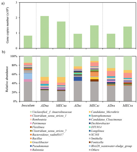 Figure 6a shows the results of the qPCR analyses of bacteria. As with archaea, all reactors experienced a notable growth in bacterial population (in comparison to the inoculum). Again, and similarly to archaea, the reactors that were not supplemented underwent the largest bacterial growth.