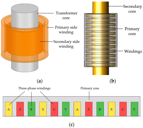 Comparison of transformer and CLIM structure. (a) Transformer, (b) CLIM, (c) winding distribution.