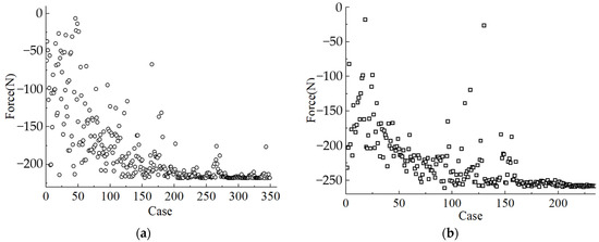 - The alternating arrangement of copper rings and iron teeth on the secondary structure of the copper ring will affect the magnetic-field distribution inside the motor, generating harmonic components of different orders in the air-gap field and thrust characteristics; the width of the copper rings and iron teeth will affect the equivalent air-gap inside the motor and the resistivity of the secondary eddy current path. To reduce the thrust pulsation of the copper-ring secondary structure, referring to the design method of the squirrel-cage rotating motor, the width of the copper ring and iron teeth should be smaller than the primary slot pitch of the motor; at the same time, taking into account the machining difficulty of the secondary structure and the structural strength, the width of the copper ring and iron teeth should be larger than 1 mm; therefore, the range of the values of the copper ring and iron teeth in the optimization is taken as [1 mm, 16 mm].