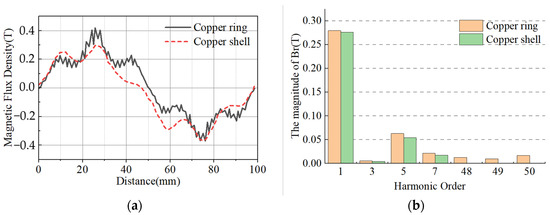 The air-gap magnetic field components of both motors have more 5th and 7th harmonic components, due to the influence of the cogging distribution on the primary structure of the motor, as shown in Figure 7b. For the CLIM with a copper-ring secondary structure, there is a large number of sawtooth fluctuations on the air-gap magnetic density waveform, which is due to the distribution of copper rings and iron teeth on the secondary structure, which means that the air-gap magnetic density has some 48th, 49th and 50th higher harmonic components. Compared with the copper-shell secondary structure, the iron teeth on the copper-ring secondary structure reduce the equivalent air-gap of the motor and lower the equivalent reluctance. As a result, the copper-ring secondary structure still has a high air-gap flux density, despite its high harmonic content.