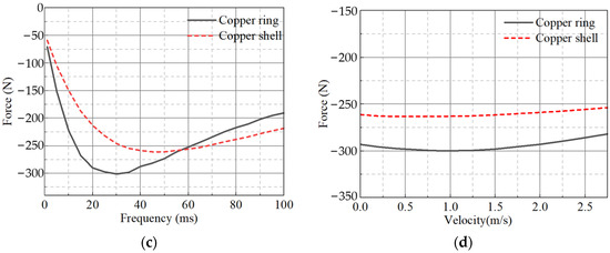 Figure 8c,d show the thrust with the different frequencies and velocities. The frequencies of peak thrust are different for the two CLIM configurations at the same operating speed, and the copper-ring secondary CLIM has more peak thrust. At low speeds, CLIM outputs a stable thrust that varies little with speed. The efficiency and power factor of both motor topologies are shown in Table 4. Provided that the design requirements are met, it is clear that the copper-ring secondary structure is significantly more efficient. The CLIM designed in this paper is designed with thrust maximization as the main design objective, and the motor operates at a deficient speed (0.02 m/s) with the slip rate of the motor close to 1. Therefore, the CLIM designed in this paper has a low power factor relative to conventional induction motors. Compared with rotary motor-driven, hydraulically-driven, and magnetically-driven CRDMs, the use of CLIM as a CRDM actuator eliminates the need for a complex transmission mechanism and directly generates linear motion, which simplifies the CRDM structure, reduces weight, and decreases equipment size. Therefore, applying CLIM technology to CRDM has good development prospects.