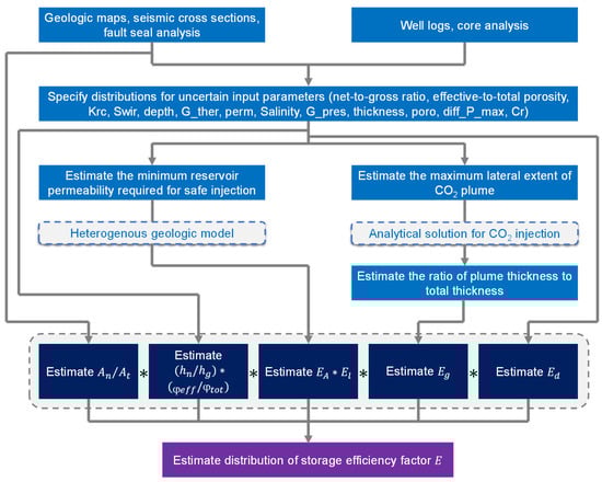Workflow diagram summarizing the steps in estimation and uncertainty quantification of the storage efficiency factor. The selected uncertain input parameters are the effective-to-total porosity (phie/phit), maximum allowable pressure buildup (diff_P_max), net-to-gross thickness ratio (net_gross), irreducible water saturation (Swir), permeability (perm), thickness (thickness), geothermal gradient (G_ther), depth (depth), maximum relative permeability to CO2 (Krc), rock compressibility (Cr), pressure gradient (G_pres), salinity of brine (Salinity), and the porosity (poro).