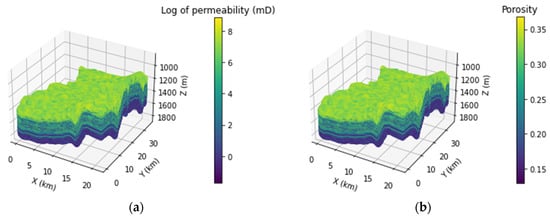 The 3D heterogeneous geologic model included in the Smeaheia dataset []: (a) the natural logarithm of the permeability value measured in millidarcy (mD) and (b) the porosity measured in fraction.