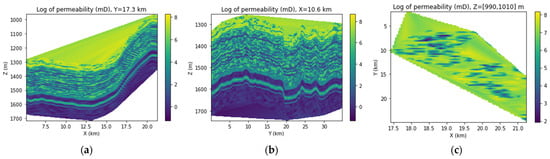 Example 2D slices of the 3D heterogeneous geologic model included in the Smeaheia dataset []: (a) the natural logarithm of permeability (mD) in the x-z cross section at y = 17.3 km; (b) the natural logarithm of permeability (mD) in the y-z cross section at x = 10.6 km and (c) the natural logarithm of permeability (mD) in the x-y slice at the depth range from 990 m to 1010 m.