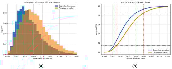(a) The histograms and (b) empirical cumulative density function plots showing the distributions of the storage efficiency factor for the Sognefjord formation and Fensfjord formation. The green and red dashed lines indicate the 15th and 85th percentiles of the storage efficiency factor for the Sognefjord formation and Fensfjord formation, respectively.