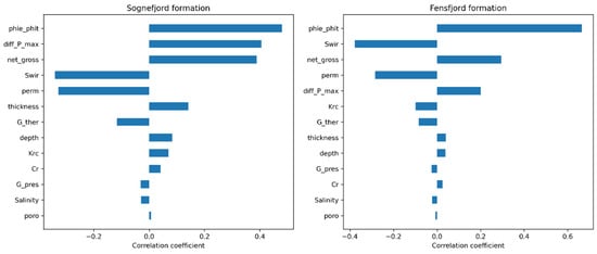 Correlation coefficients between the storage efficiency factor and each uncertain input parameter in the uncertainty analysis for the Sognefjord formation and Fensfjord formation. The uncertain input parameters listed on the y axis are the effective-to-total porosity (phie/phit), maximum allowable pressure buildup (diff_P_max), net-to-gross thickness ratio (net_gross), irreducible water saturation (Swir), permeability (perm), thickness (thickness), geothermal gradient (G_ther), depth (depth), maximum relative permeability to CO2 (Krc), rock compressibility (Cr), pressure gradient (G_pres), salinity of brine (Salinity), and porosity (poro). The order of the uncertain input parameters on the y axis indicates the rank in terms of contribution to the overall uncertainty in the storage efficiency factor estimation.