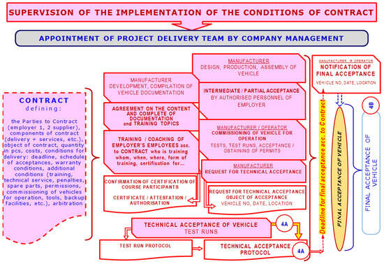 The managers of the organisation, as the persons responsible under the national law for the technical safety of the purchased railway vehicle, require, in the course of the procurement–project (design, production, and operation) procedure, the development of an appropriate Engineering Safety Management (EMS) System, which should ensure effective implementation of the certification process prior to the commissioning of the vehicle for operation. The purpose of a railway vehicle purchasing project is therefore to ensure that the level of safety estimated during the process of the design, production, and testing will be possible to achieve in the course of everyday operation and will not bring them into conflict with the law as a result of any negligence during the implementation of any one of the phases of the project.