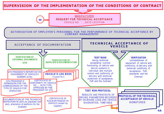 In the context of the railway transport operator’s current and planned new vehicle purchases, a team of experts audited the previous purchase and operation of a specific manufacturer’s rail vehicle, from a railway safety perspective and operational requirements [21]. The purpose of this audit was also to develop a methodology and procedures for the purchase of railway vehicles to be used by the operator in the future. A team of specialists in the field of verification of contracts, agreements, purchasing documentation (ToR), and manufacturer’s acceptance documentation was appointed for the analysis of railway safety requirements [22,23]. This team also carried out an assessment of adequate compliance with the provisions of railway safety requirements of the below-mentioned documentation and evaluated compliance with the requirements included therein concerning the following: