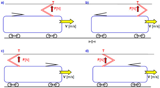 There is also a lack of unambiguous regulations taking into account the results of aerodynamic tests, depending on the speed and direction of travel, recommending the most favourable configuration of the pantograph in vehicles (Figure 8). Various configurations of the pantograph–catenary system not only affect the durability of the system but also have an impact on energy-related issues.