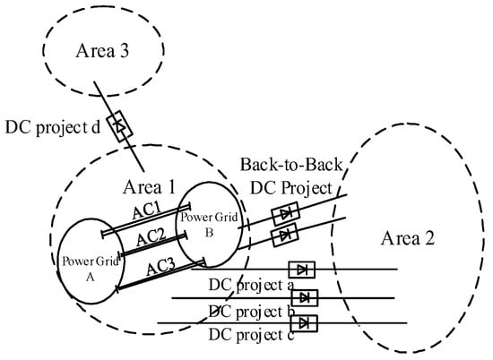 Area 1′s power grid is interconnected through several DC projects, including a ±800 kV line (6400 MW), a ±800 kV line (7200 MW), a ±800 kV line (8000 MW), a ±500 kV line (3000 MW), and a back-to-back ±420 kV line (5000 MW), connecting with the external power grid. The grid in Area 1 consists of six major hydropower channels, and this study focuses on it. The impact of frequency variations on DC transmission power at the receiving end is disregarded. The DC project d and three major UHVDC transmission lines are operating at full capacity. This is achieved using constant current control on the rectifier side and constant voltage control on the inverter side. The back-to-back DC project exports 2000 MW of power.